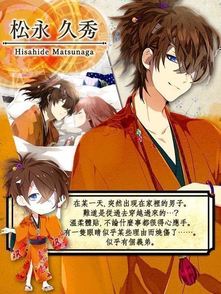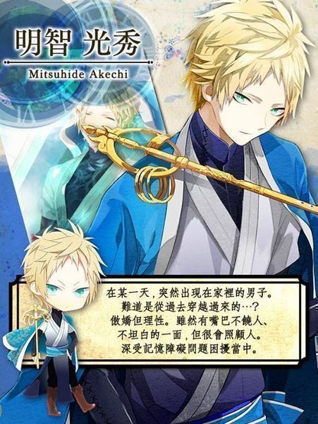身為一名戰國武將,精通各種知識。 不喜歡爆破和火。 溫柔體貼, 女性至上主義者。 對現代生活擁有高度的適應能力, 並具有優秀的溝通能力。 雖然看似無憂無慮, 但…。似乎有個弟弟, 但詳細不明。 ●織田信長/CV.保志總一朗 身為一名戰國武將, 明智光秀的摯友。 然而在本能寺被光秀背叛之後, 開始不信任他人。 而光秀卻似乎不記得那件事…。 實際似乎是擁有特別的能力一族, 但詳細狀況不明。 極度的讀書狂, 帶有極度獲取知識的慾望。 有自己的一套步調, 專注讀書時甚至會忘了進食。 ●時野彼方/CV.鈴村健一 女主角的同學, 同社團的朋友。 常常捉弄女主角, 愛欺負人。 在商店街的豆腐店, 和祖母兩人相依為命。 對那些從過去穿越到現代的人似乎有些了解…。 ●茨木/CV.甲斐田幸 出現在女主角面前的神秘男子。 常留下許多的建議和警告, 但…。 女主角總覺得他有種熟悉的感覺。 ●果心居士/CV.小林優 出現在女主角們前面的少年。 對光秀相當珍惜, 甚至可看出異樣的執著。 【果心居士】這個名字似乎是個假名…… ▼游戏特色 ■故事 随著故事的进展, 会出现「恋爱的选择」或「命运的选择」。 根据选择的不同, 会影响到之后故事的发展, 故事走向就取决在你的手上。 在人物配件任务中, 突破特别任务的话, 可以看见你从未看过、专属他的特别剧照唷。 ■人物配件 发挥你的时尚品味, 搭配不同的人物配件来装饰你在游戏中的模样吧。 这次还追加了男角的替换人物配件的功能。 快来享受和他一起换装的乐趣吧。 [img=0,1]https://www.pujia8.com/static/uploads/20150119223701_80.jpg[/img]